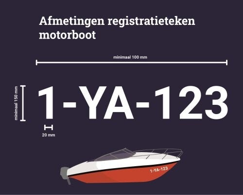 Het registratieteken voor motorboten is minimaal 150 millimeter hoog en 100 millimeter breed. De verticale balk in de letter (stamdikte) is minstens 20 millimeter breed.