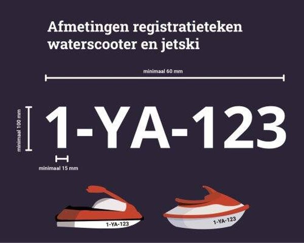 Heeft u een waterscooter of jetski? Het teken is dan minimaal 100 millimeter hoog en 60 millimeter breed. De verticale balk in de letter (stamdikte) is minstens 15 millimeter breed.